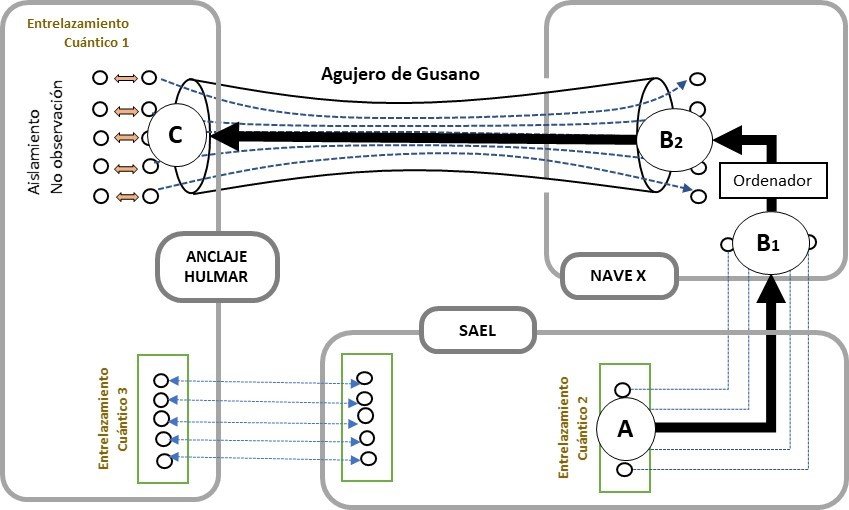 Otro importante aspecto es el uso del entrelazamiento cuántico entre todas las partes del experimento. La nave X puede recibir, mediante este entrelazamiento, información de la colonia de Sael en un plano temporal distinto del plano temporal en el que está inmerso el agujero de gusano. Supondremos que el agujero de gusano tendrá un diámetro de nanómetros y que los datos a transmitir no pueden superar los 500 bits (el volumen de información entrelazado cuánticamente y que es posible trasladar por el agujero de gusano) antes de que el agujero colapse.