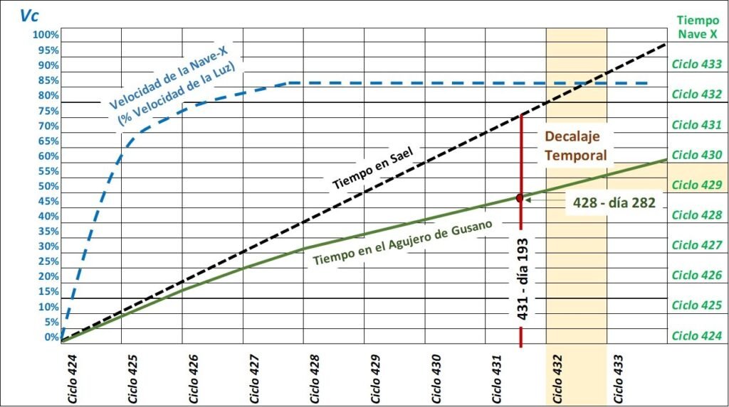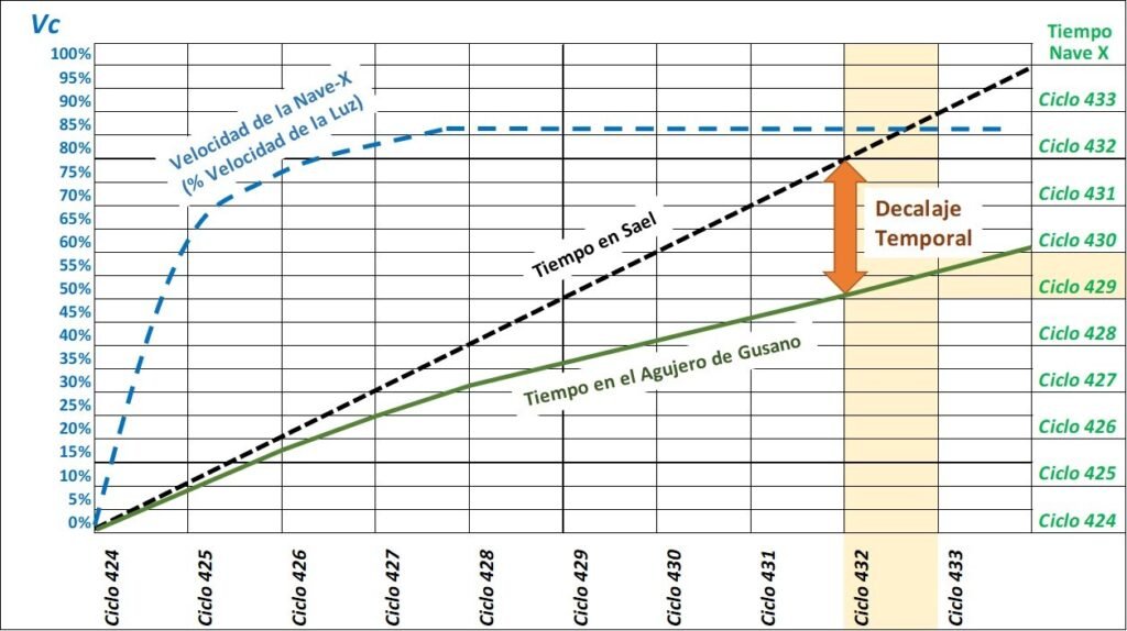 Imagina que alcanzamos un decalaje de tiempo entre los dos extremos del agujero de gusano de unos 3 ciclos.Es decir, mientras en el extremo viajero sólo se ha alcanzado el ciclo 429, en la colonia de Sael estamos en el ciclo 432. Por ello, si desde Sael le damos una información a la nave X, esta podrá transmitirla a través del agujero de gusano a la HULMAR que estaría en el ciclo 429